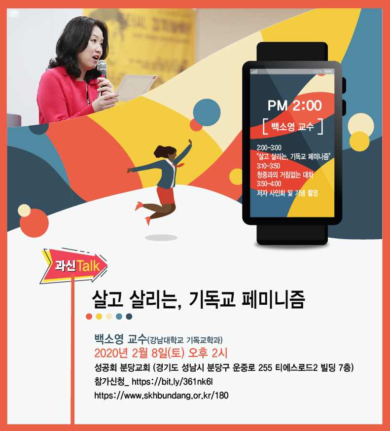 '페미니즘'은 우리 사회의 가장 중요한 키워드가 되었음에도 여전히 기독교와 교회에서는 낯설기만 합니다. 성공회 분당교회에서 과신대와 함게 과신톡 행사를 준비했습니다. 기독교와 페미니즘에 대해 평소 궁금했던 내용을 백소영 교수님께 허심탄회하게 묻고 이야기하는 시간을 준비했습니다. 누구든지 참여하실 수 있습니다.