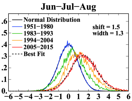 아래 그래프를 보면(143쪽) 과거(1951년에서 1980년)를 나타내는 청색 선 보다 최근(2005년에서 2015년)의 분포를 나타내는 적색 선이 오른쪽으로 치우쳐져 있습니다. 현재에 가까운 시기일수록 오른쪽으로 치우치는 모습입니다. 가로축은 기온과 기후 값의 차이를 표준편차로 나눈 값인데, 최근에는 과거에 비해 높은 기온이 나타날 확률이 증가했음을 나타냅니다.