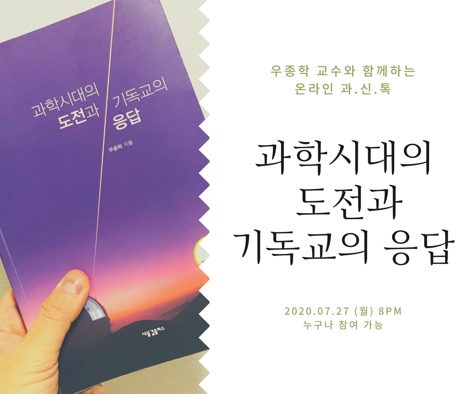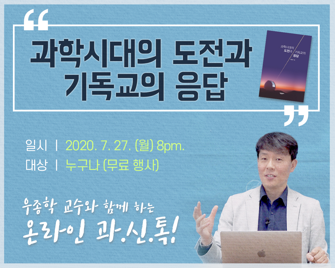 * 우종학 교수님과 이야기를 나누기 전에 <과학 시대의 도전과 기독교의 응답>(새물결플러스)를 읽고 참여하시면 논의를 진행하는 데 도움이 될 겁니다.