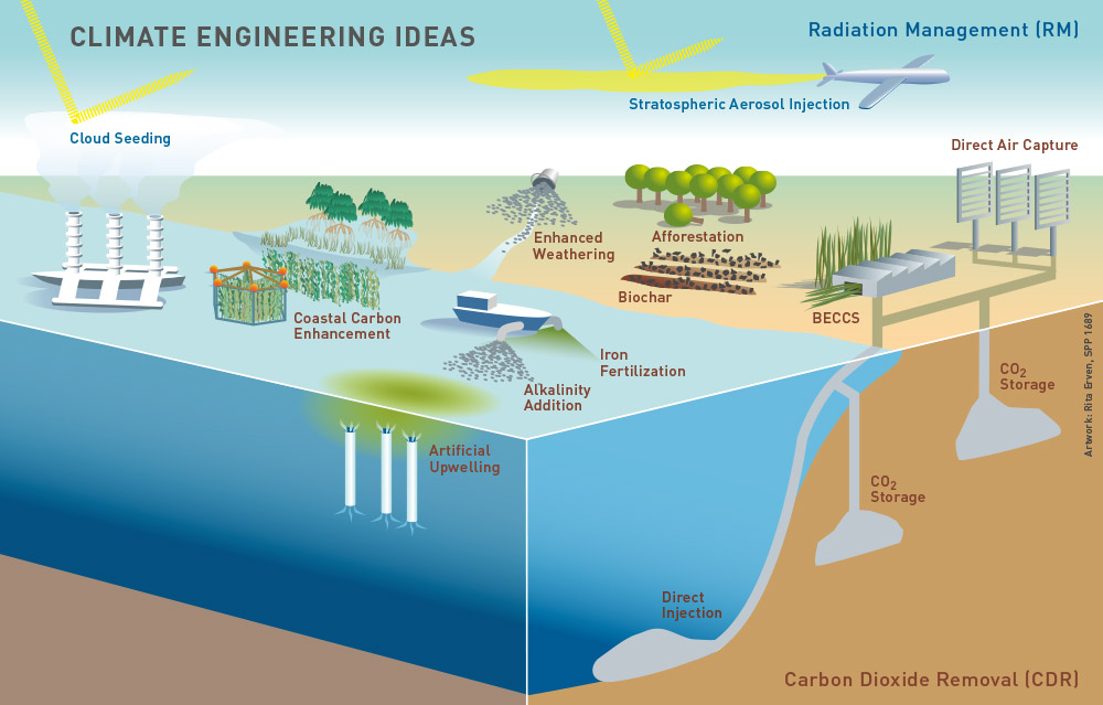 이를테면 직사광선을 막아주는 나무 그늘에 있거나 양산을 쓰면 시원해지듯이, 성층권에 햇빛을 반사할 수 있는 화학물질을 비행기로 주입한다거나 바다에 대형 가습기를 띄워서 구름을 많이 만들거나, 지구와 태양 사이 우주 공간에 빛을 반사하는 거울을 가진 우주정거장을 띄우자는 등 많은 아이디어가 공론화되었습니다. 실제로 화산 활동으로 인해 화산재가 햇빛을 차단하기도 하는데, 화산 분출 시 방출되는 이산화황(SO2)이 성층권에 도달하면 산화과정을 거쳐 황산 에어로졸이 되어 햇빛을 차단하여 성층권 온도는 높이고 지표면의 온도는 낮추는 효과를 낳습니다.