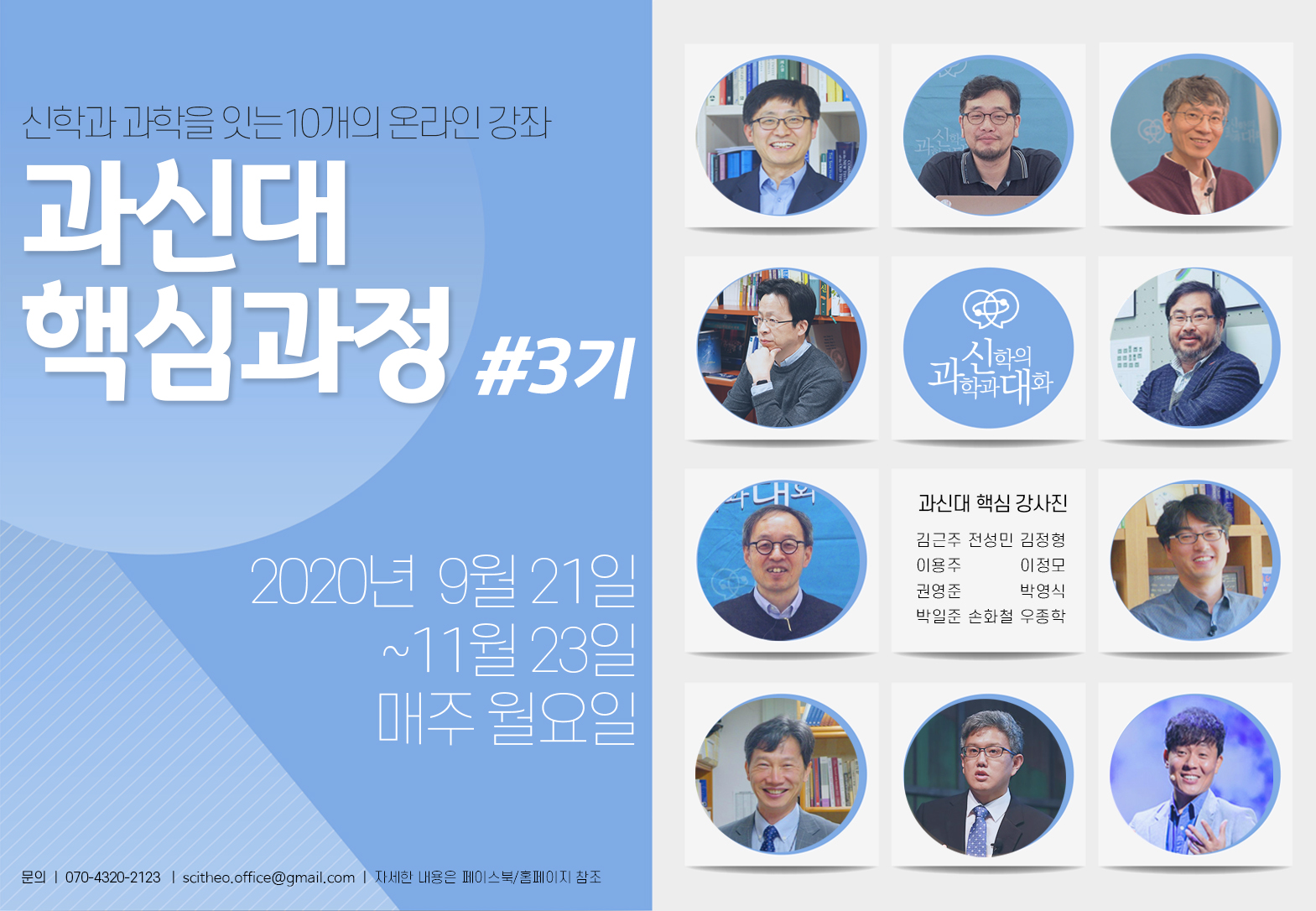 그동안 과학과 신앙에 대해 일목요연하게 배울 수 있는 기회가 없었다구요? 성경과 신학, 과학, 그리고 윤리를 포함한 주요 내용을 배울 수 있는 새로운 교육과정 과신대 핵심과정을 시작합니다. 핵심과정은 10명의 전문가로부터 성서학, 창세기 해석, 조직신학의 창조론, 현대과학에 대한 신학자들의 입장, 자연의 역사, 과학에 대한 이해, 무신론, 다양한 창조의 관점, 과학과 윤리 등 핵심적인 주제를 배우는 강좌 시리즈입니다. 과신대 핵심과정은 신학교나 일반대학 등에서 찾아볼 수 없는 커리큘럼으로 과학과 신앙에 대해 체계적으로 배울 수 있는 기회를 제공하여 목회자나 교사를 포함하여 일반 교인들이 누구나 참여할 수 있는 교육 기회를 제공합니다.