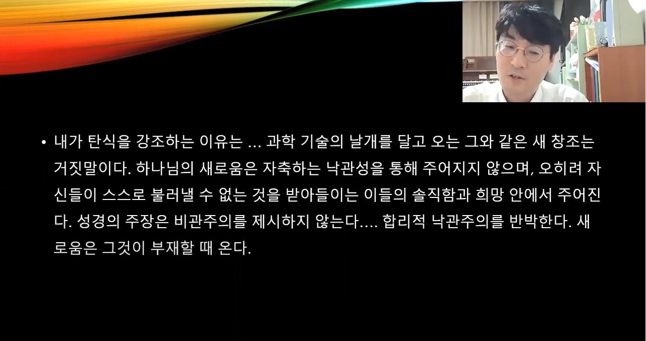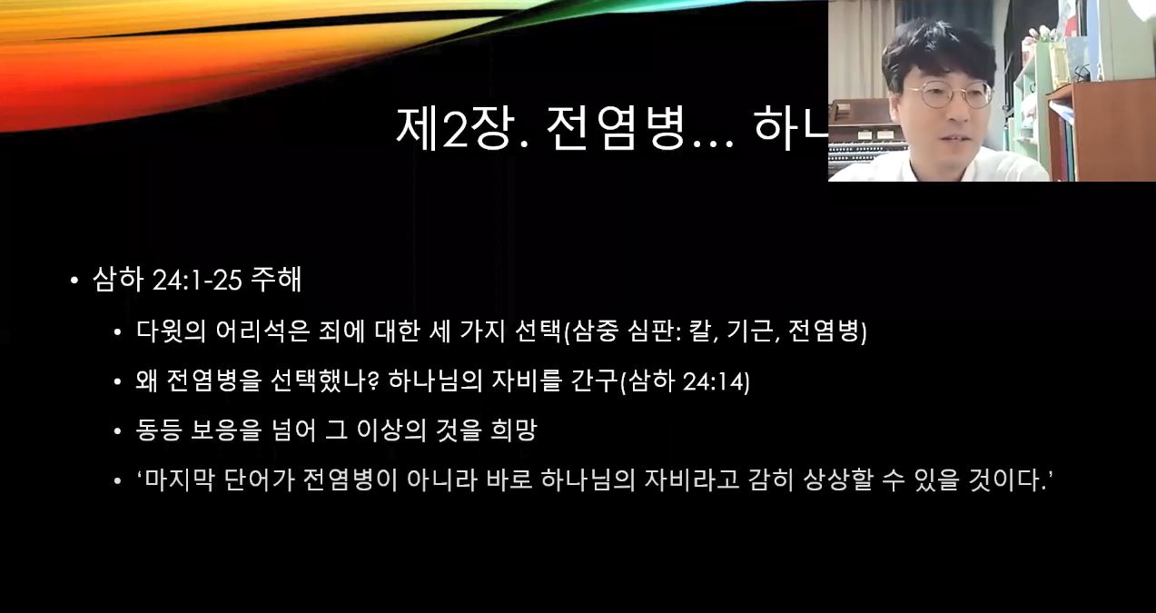 한 주 뒤에는 월터 브루그만의 『다시 춤추기 시작할 때까지』를 살펴보는 시간을 가졌습니다. 이 책은 총 7장으로 구성되어 있으며, 성경 본문 해석을 중심으로 내용이 전개되는 특징을 가집니다. 월터 브루그만은 구약학자답게 구약성경 본문을 분석하면서 코로나19를 조명합니다. 그는 구약성경에서 전염병이 나타나는 배경에 대해 언급하였는데, 첫째는 언약의 집행 방식, 둘째는 하나님의 권능의 현현, 셋째는 하나님의 거룩한 영광을 위해서라고 이야기합니다. 브루그만은 전염병이 반드시 하나님의 심판을 의미하는 게 아니라 자비를 나타내기도 한다고 말했습니다. 여기에 추가적으로 박영식 교수님께서는 노아의 방주 이야기를 언급하셨습니다. 노아의 홍수 심판은 결코 하나님께서 인간을 징벌하기 위한 도구로만 인식될 수는 없습니다. 왜냐하면 하나님께서 홍수 뒤에 ‘무지개’를 보여주시면서 앞으로 다시는 이러한 심판을 내리지 않겠다는 자비의 모습을 함께 드러내시기 때문입니다.