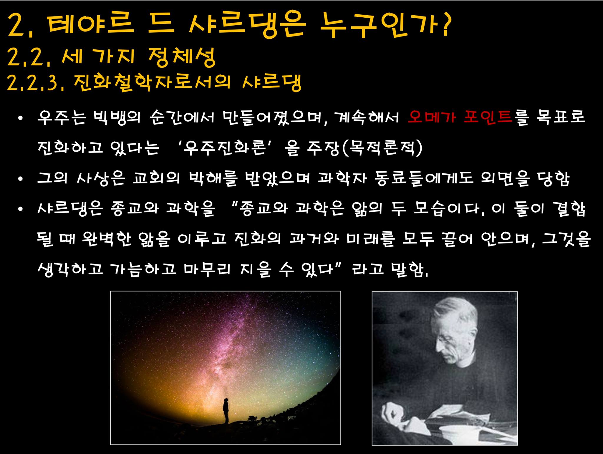 샤르댕은 예수회 신부, 고생물학자, 진화철학자로서 어느 한 쪽으로 치우치지 않고(다르게 말하면 어디서도 환영받지 못하고) 과학과 신학의 균형을 잘 잡은 인물이다 싶습니다.