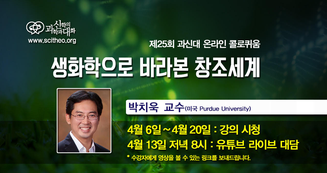 2. 지난 화요일부터 진행한 과신대 콜로퀴움은 새로운 형식으로 진행합니다. 미국 퍼듀대학교에서 생화학을 가르치시는 박치욱 교수님에게 "생화학으로 바라본 창조세계"라는 주제로 강의를 듣습니다. 박치욱 교수님께서 강의 영상을 미리 보내주셔서 그걸로 강의를 시청하고, 4월 13일에는 과신대 유튜브 채널에서 직접 라이브 대담을 진행합니다. 실시간으로 미국에 계시는 교수님과 라이브 대담을 할 수 있다니 신기하기도 하고, 기대도 됩니다. 고등학교 시절 과학시간에 뭘 배웠는지 전혀 기억이 나지 않는데, 이번 강의는 그 시절로 다시 돌아간 기분이었습니다. 어려운 내용을 쉽고 친절하게 설명해주셔서 내용은 잘 모르지만 뭔가 많은 것을 배운 기분입니다. 라이브 대담은 누구든지 들을 수 있으니 시간에 맞춰서 꼭 시청해주시고, 댓글로 질문도 많이 남겨주세요.