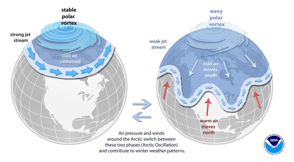 경년변동성(經年變動性, 수십 년 또는 수백 년 동안에 걸쳐 일어나는 기후요소의 변화 또는 변동)이 겨울 몬순에도 존재합니다. 어느 해는 유독 겨울 몬순, 즉 북풍이 강하여 평년보다 낮은 기온을 기록하기도 합니다. 엘니뇨/라니냐도 겨울철 온도 변동에 영향을 미치지만, 오늘은 북극에서 기원하는 변동성에 관해서만 설명하겠습니다. 그림3을 보면 북극의 극소용돌이와 제트기류(대류권의 상부 또는 성층권의 하부 좁은 영역에서 수평으로 부는 강한 공기의 흐름)가 강할 때를 모식화했고 오른쪽은 제트기류가 약할 때를 나타냈습니다. 극소용돌이란 극지방에 한정적으로 발생하는 소용돌이를 뜻하는데, 북반구 기준 반시계방향으로 회전하는 거대하고 차가운 저기압 덩어리입니다. 이 극소용돌이가 강하면 북극의 찬 공기가 열대지역의 따뜻한 공기와 섞이지 않고 분리됩니다. 따라서 극지역의 온도는 낮게 유지됩니다. 하지만 극소용돌이가 약해지면 제트기류가 평행하게 불지 않고 구불구불한 궤적을 그리게 됩니다. 이렇게 되면 북풍이 부는 지역은 찬 공기가 북극에서부터 내려와 이례적인 한파를 겪게 됩니다. 올해 1월 영하 20℃ 가까이 떨어졌던 서울의 기온과 텍사스의 이례적인 한파도 이러한 극소용돌이의 약화와 제트기류의 사행(구불구불한 움직임)으로 설명할 수 있습니다.