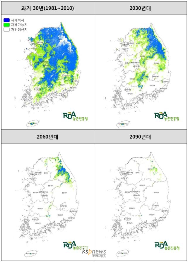 이에 따라 농촌진흥청은 기후변화 시나리오를 이용하여 6대 과수 작물인 사과·배·복숭아·포도·단감·감귤에 대한 작물별 재배지 변동 예측 지도를 개발했습니다. 지구온난화가 진행되면서 사과의 재배면적은 지속적으로 줄었으며, 배·복숭아·포도는 21세기 중반까지 조금 늘어나다가 다시 감소했습니다. 반대로, 단감과 감귤은 계속해서 증가하는 것으로 예측되었습니다. 과거 제주도에서만 나던 감귤의 재배지가 최근 남해안 주변으로까지 늘어났습니다.
