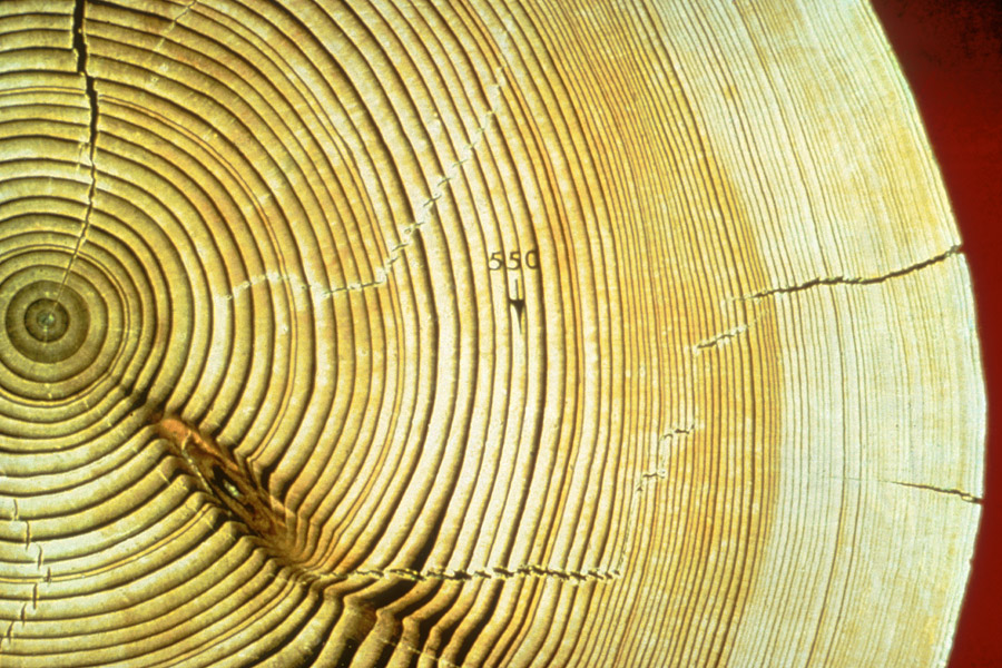 나무의 나이테를 유심히 본 적이 있나요? 색이 옅은 층과 진한 층이 번갈아가며 나타납니다. 여름처럼 온도가 높고 강수량이 충분하여 나무가 성장하기 좋은 시기에는 나무가 빠르게 자라면서 나이테가 하얗고 두껍게 만들어집니다. 반대로 겨울처럼 천천히 성장하는 시기에는 검고 얇은 나이테가 생깁니다.(사진2) 이렇게 계절에 따라 나이테 폭이 달라지지만, 매년 달라지는 기후조건(경년변동성)에 따라서도 나이테 폭은 변합니다. 춥고 건조한 해일수록 나무가 잘 자라지 못해 나이테 폭이 짧고, 따뜻하고 습한 해일수록 나무가 잘 자라 나이테 폭이 길어집니다. 이런 차이는 나이테에 기록이 되어, 그 지역 고기후 연구의 좋은 사료가 됩니다. 세계에서 가장 긴 나무 나이테 연대기는 약 1만 년입니다. 이는 아일랜드의 참나무류를 이용해 만든 것입니다. 나이테 연대기는 살아있는 나무뿐 아니라 오래된 건축물에 사용된 목재로도 분석할 수 있습니다. 우리나라는 약 800년 전까지 기후 복원을 진행했다고 합니다.