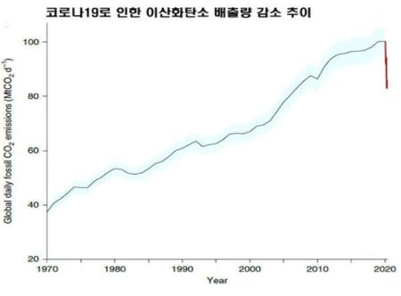 코로나 19의 영향으로 이산화탄소 배출량이 큰 폭으로 감소하였습니다.