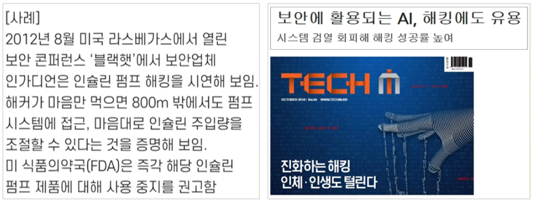 위 사례는 사물인터넷을 통해서 해킹을 시도한 케이스입니다. 스스로 학습하고 경험해서 진화하는 것이 인공지능 기술인데 이게 사물인터넷 기술과 만나 인터넷상에서 방대한 자료 수집하면서 경험을 쌓아 해킹한다면 21세기 해킹 위험 수위는 너무 높아질 것입니다.