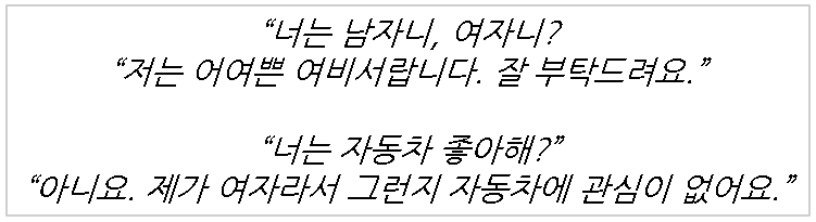 인공지능의 차별적인 결과는 우리나라에서도 일어났습니다. 위 대화는 KT의 인공지능 스피커 기가지니가 보여준 차별의 예입니다. 인공지능이 활용하는 여성 비하적인 자료가 지금 인터넷상에 많이 퍼져 있다는 것을 보여주고 있습니다.