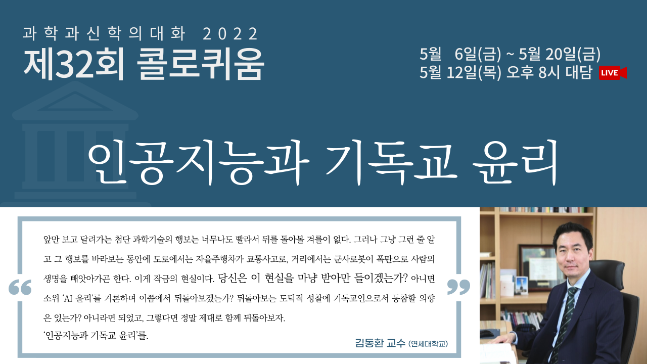 제31회 과신대 콜로퀴움에서는 연세대학교 연합신학대학원의 김동환 교수님을 강연자로 초청하여 ‘인공지능과 기독교 윤리’라는 주제로 강의를 들었습니다. 너무도 빨리 변화하는 첨단 과학기술의 행보가 자율주행차의 교통사고와 군사로봇의 생명 위협 등에 직면하게 하는 현실에 대해 네 가지 이슈와 연관된 질문을 가지고 기독교인으로서 어떻게 성찰해야 하는가를 생각해보는 좋은 시간이었습니다.