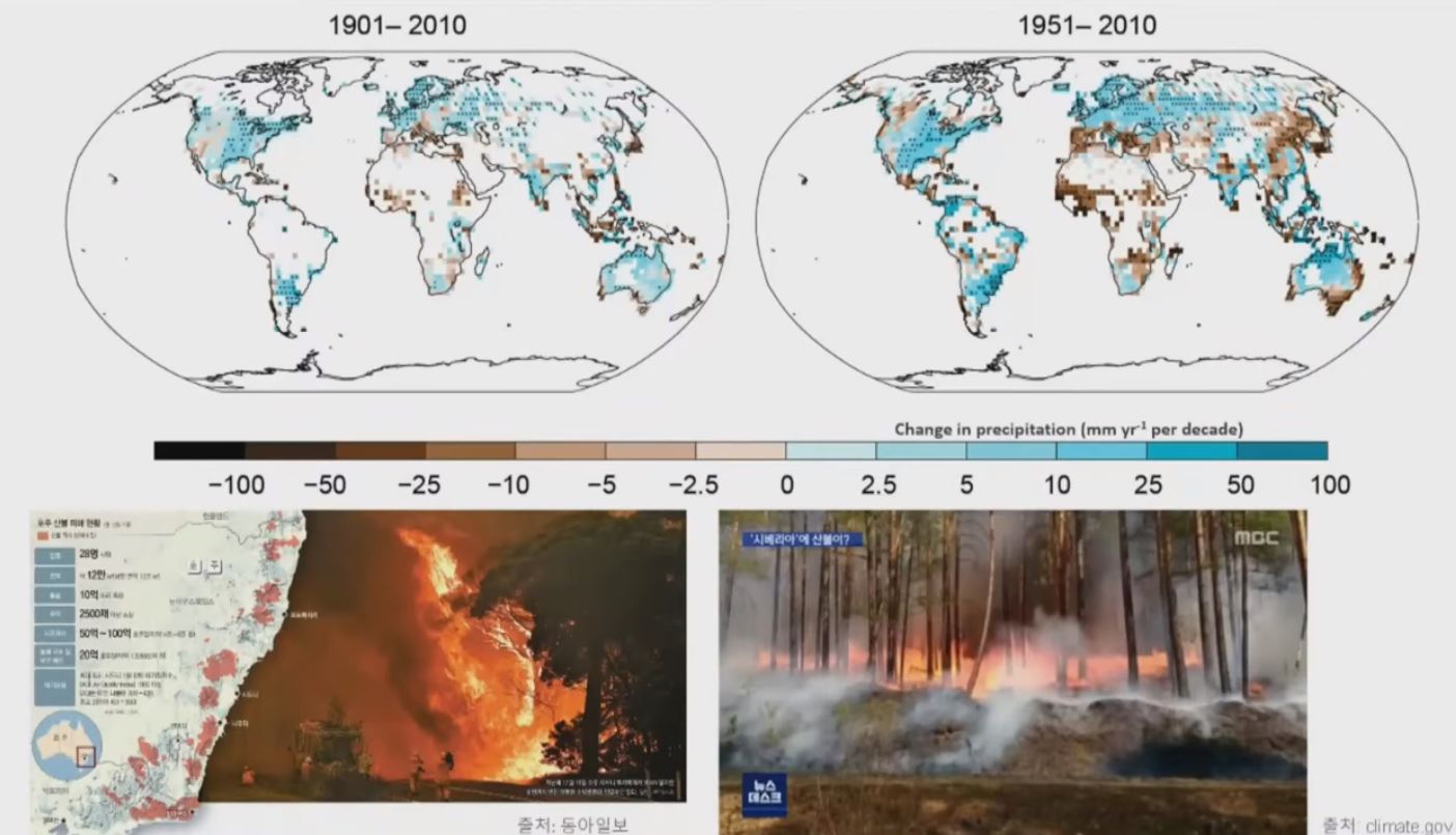 기후변화는 강수량에도 영향을 미칩니다. 위 그림에서 기준보다 강수량이 높아지면 하늘색, 낮으면 갈색으로 표시하였습니다. 과거의 110년과 60년 동안의 기간을 보면 유럽 지역은 강수량이 증가한 반면 아프리카는 매우 건조하다는 것을 알 수 있습니다. 건조해진 아프리카가 농사를 지을 수 없게 되고 그래서 유럽으로 이주하는 것입니다. 유럽의 부담으로 이어지는 것이죠. 호주와 시베리아에서는 산불이 많이 났었습니다. 나무가 다 타버리게 되니 광합성을 못해서 악순환이 나타나게 되는 것입니다.