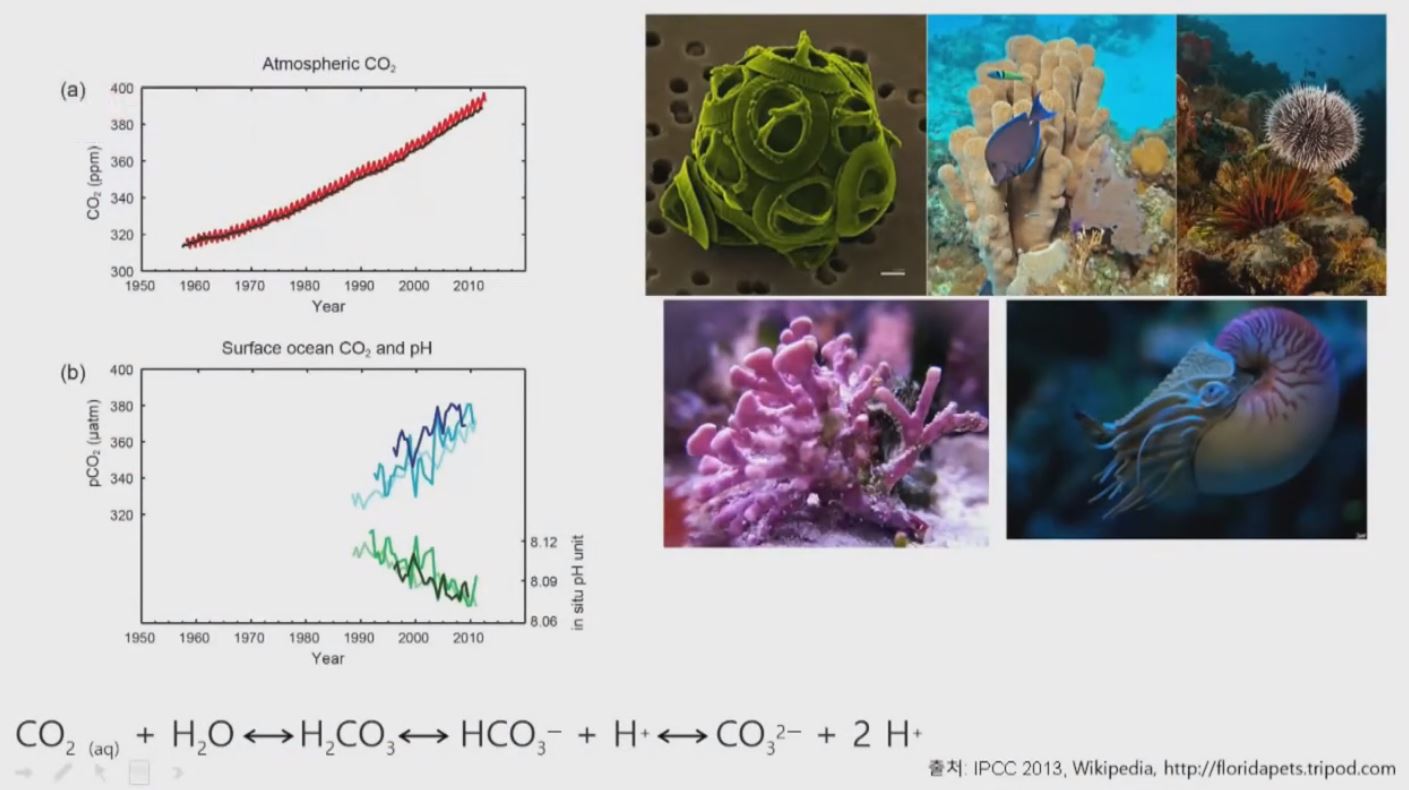 위 그림에서 좌측 상단의 그래프가 대기 중 이산화탄소(CO2) 농도를 지속적으로 측정한 결과입니다. 사람들의 영향을 받지 않기 위해 매일 하와이에 아주 높은 산에 올라가서 포집한 기체를 분석한 것입니다. 이미 우리나라뿐만 아니라 심지어 북극도 이산화탄소 농도가 400ppm을 넘어섰다고 합니다. 이산화탄소 농도가 높아지면서 바닷물에 녹지 않아 대기 중의 농도가 높아진 것입니다. 바닷물에 이산화탄소가 녹아 들어가면 화학 반응으로 H+가 나오게 되는데 이게 산 연계를 결정하는 기준이 됩니다. H+가 많아지면 산성이 되는 거죠. 결국 PH가 낮아지게 되어 해양생태계 변화가 생기게 된다는 것을 알 수 있는데 실제로 플랑크톤의 조성이 바뀌게 되었습니다. 왼쪽 하단 그래프의 초록색이 광합성을 하는 식물성 플랑크톤인데 이게 줄고 다른 플랑크톤이 증가한 것을 알 수 있습니다. 앞으로는 어류의 변화가 나타날 것이고 다양한 변화가 발생할 것입니다. 탄산칼슘 껍데기를 갖는 조개류들이 흐물흐물해질 수 있지 않을까 염려가 되기도 합니다.