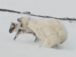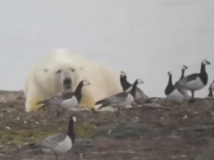 북극곰은 원래 물개나 물범을 주로 사냥해서 먹고 사는 동물인데 최근에는 다른 것을 더 많이 먹는데 바로 새 알입니다. 얼마나 많이 먹는지 흰뺨기러기의 개체 수가 확연하게 줄어들 정도라고 합니다. 그런가 하면 순록을 사냥하는 모습이 종종 관찰되고 있습니다. 북극곰이 순록을 좋아하는 편이 아니었는데 식성이 바뀌게 된 것입니다.