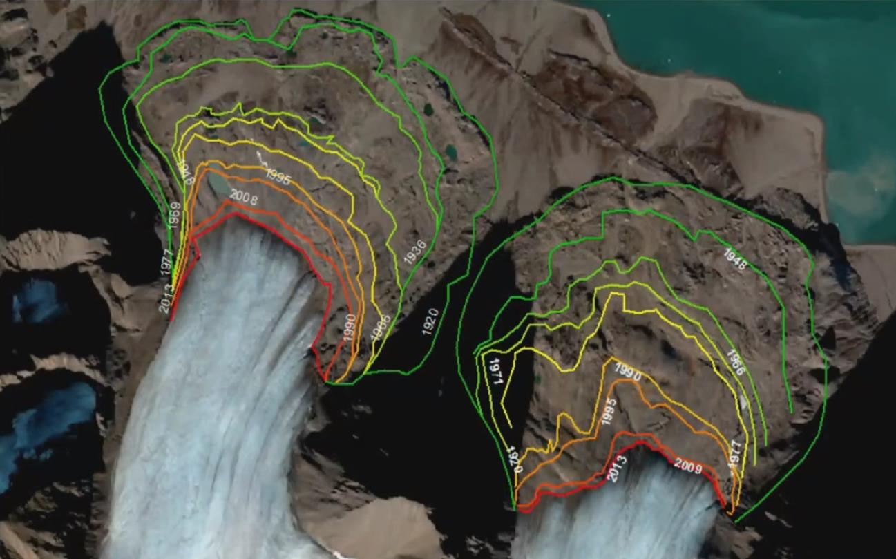 위 그림은 항공사진과 인공위성 사진으로 만들어낸 지도입니다. 가장 바깥쪽 라인이 1920년에 얼음이 덮였던 곳입니다. 매년 얼음이 점점 사라지고 있다는 것을 확인할 수 있습니다. 굳이 항공사진이 아니어도 연구하러 갈 때마다 얼음이 사라지고 있다는 게 눈으로 봐도 확인이 된다고 합니다.